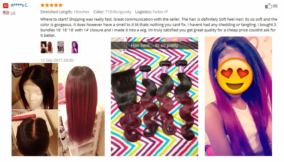 On-time Delivery: If you do not receive your purchase within 60 days, you can ask for a full refund before order completion (when you click "Confirm Order Received" or exceed confirmation timeframe).Excellent Special Soft Feel Hair Ombre Brazilian Hair Body Wave 1B/Burgundy Ombre Hair Bundles Weave 99J Red Remy Human Hair Extension 10-28 Inch
