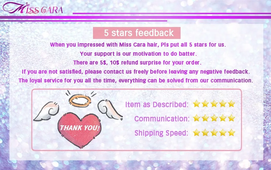 On-time Delivery: If you do not receive your purchase within 60 days, you can ask for a full refund before order completion (when you click "Confirm Order Received" or exceed confirmation timeframe).Fantastic Sale Miss Cara Brazilian Body Wave 100% Human Hair Weave Bundles Extensions Natural Color Remy Hair 8"-28" Inch Free Shipping