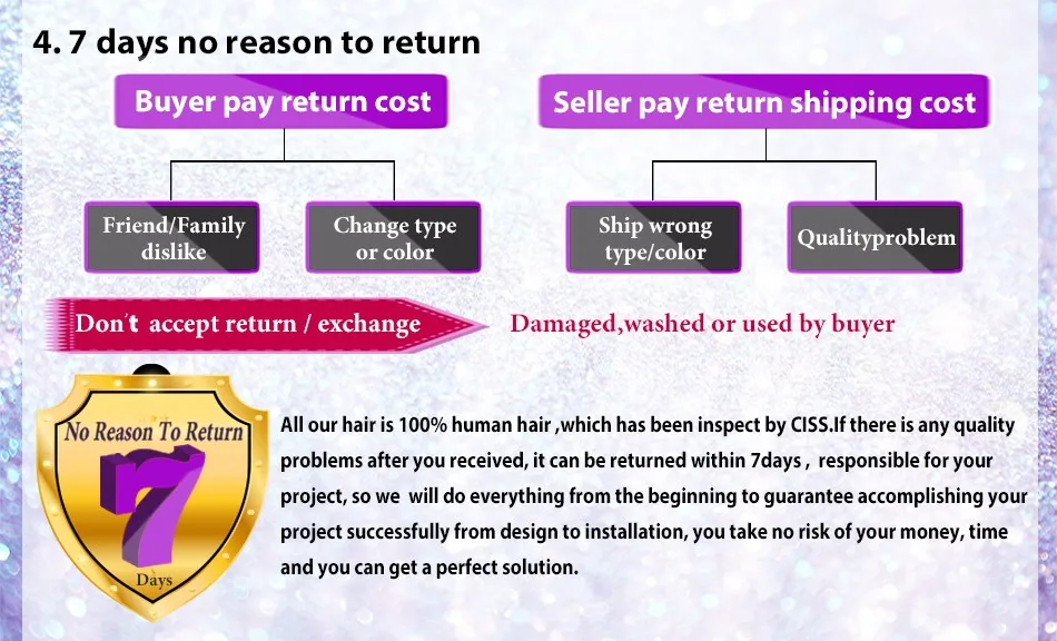 If the product you receive is not as described or low quality, the seller promises that you may return it before order completion (when you click "Confirm Order Received" or exceed confirmation timeframe) and receive a full refund. The return shipping fee will be paid by you. Or, you can choose to keep the product and agree the refund amount directly with the seller.N.B.: If the seller provides the "Longer Protection" service on this product, you may ask for refund up to 15 days after order completion.