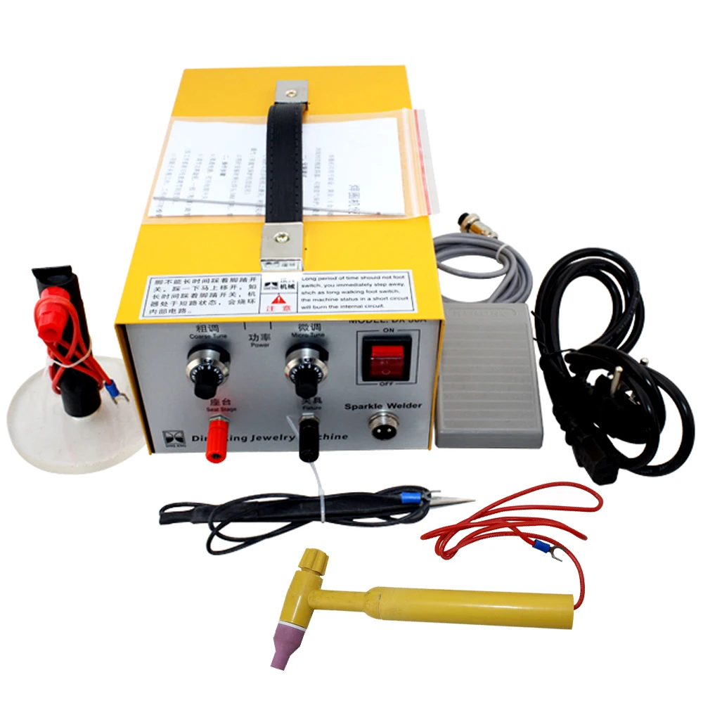 1 uses high-frequency plasma discharge principle, the formation of the metal weld puddle moment 2 adjust the output power of different sizes according to wire 3 of the workpiece smooth, firm, fast, high efficiency Technical parameters: Power: 220v 50/60HZ Power: 200W Dimensions: 300 * 180 * 140MM Installation: 1 electrode holder connected to the output negative electrode holder connected to the positive output. 2 can be sharpened tungsten needles on the grinding machine, the use of point discharge principle. 3 tungsten needle to be extended when installing the weld head 50mm. Tungsten needle diameter 1mm Steps: 1 power on, turn on the power switch. 2 adjust the power knob into coarse and fine. According to job requirements can be adjusted scale value 3 tweezers clamped workpiece. Workpiece interface alignment tungsten needle (best distance for 5mm) can not contact the workpiece. 4 with the foot about a foot switch. (Feet away). Welding is completed. Note: 1 foot stepping on the foot switch is not a long time, step on right away, as long stepping switch, the machine is short-circuited, it will burn out the internal circuit 2 This machine is a precision please use care. 3 flash of eye injury, do protective measures to use. 4 foot switch is depressed, the hand Do not touch the metal parts of the tungsten needle and tweezers, otherwise there will be tingling. 5 non-professionals do not overhaul, there are high pressure.